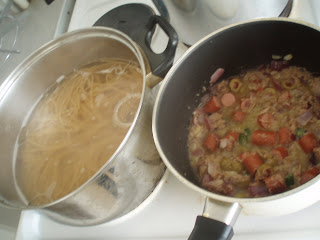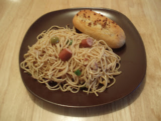 Tonight I have made garlic bread, and my fave: Spag noodles with tuna, chillis and Olives.